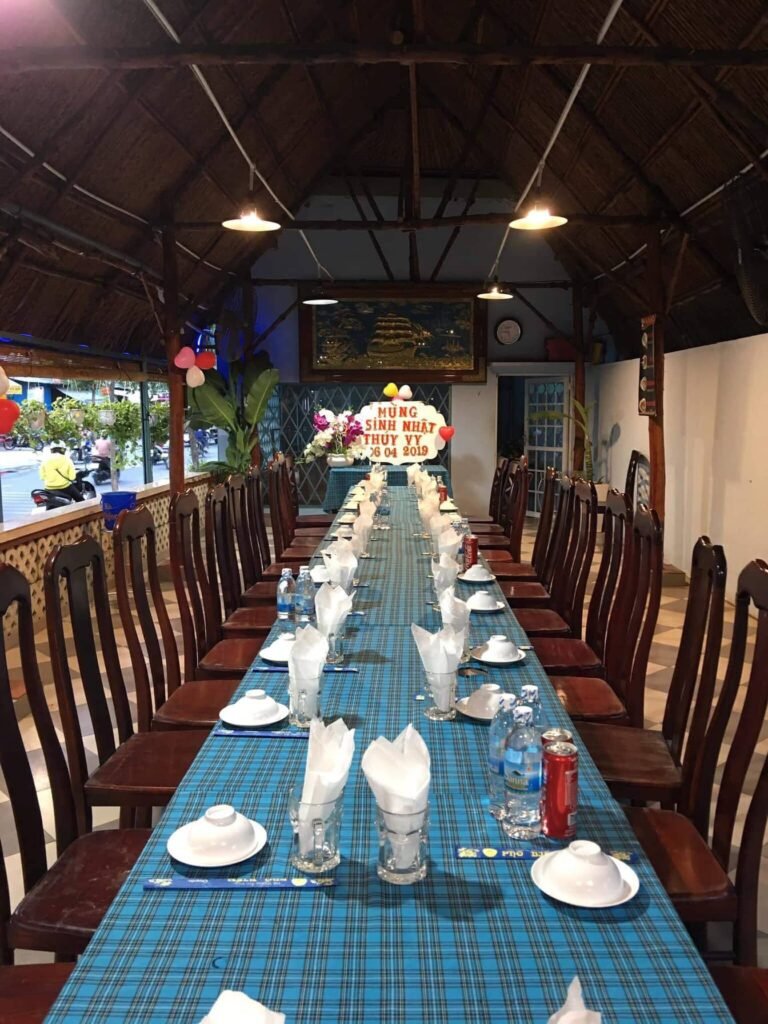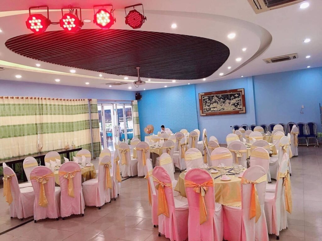 Quán diện tích 1700m2, gồm 7 phòng vip, 2 phòng tiệc lớn (p1 chứa 12 bàn tròn, p2 chứa 6 bàn tròn)