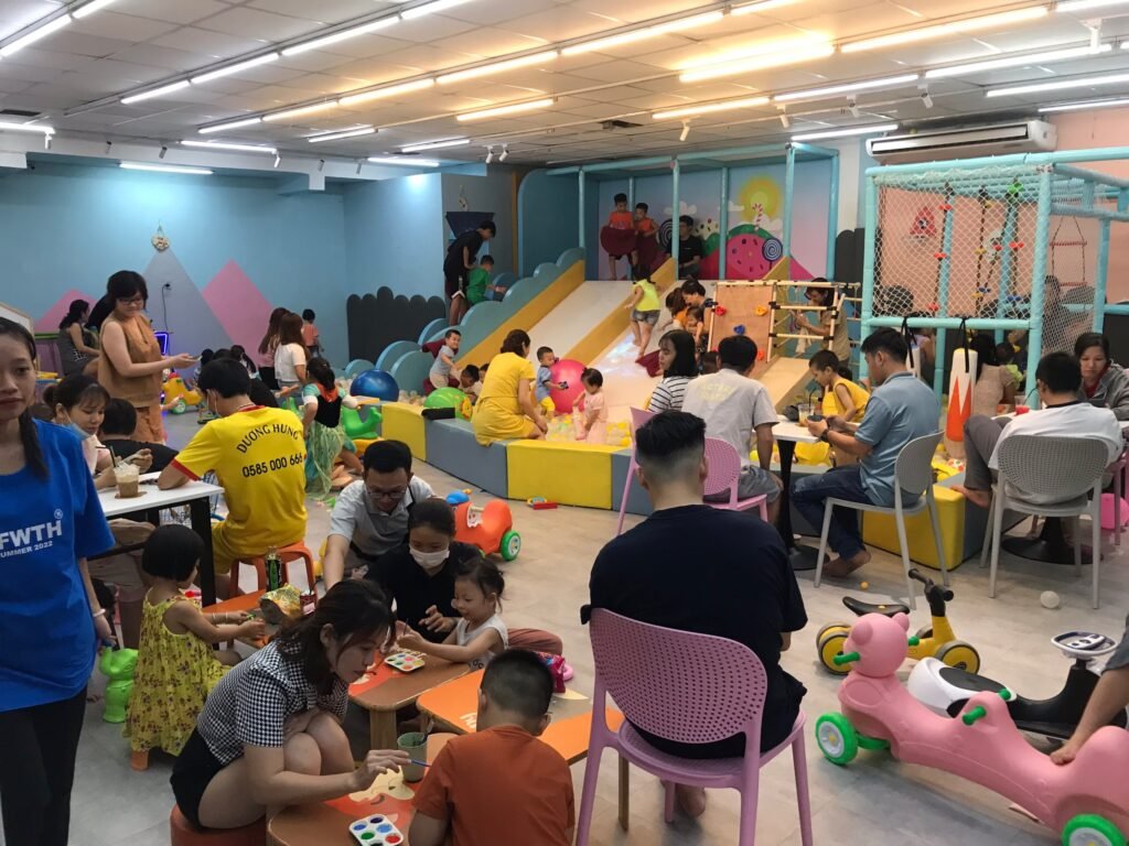Sang khu vui chơi trẻ em kết hợp cafe, đồ ăn vặt ( đây là mô hình đang rất hót hiện nay, doanh thu song song từ bán vé vào cửa cho các bé, bán đồ uống, đồ ăn vặt, tô tượng, máy gắp thú)